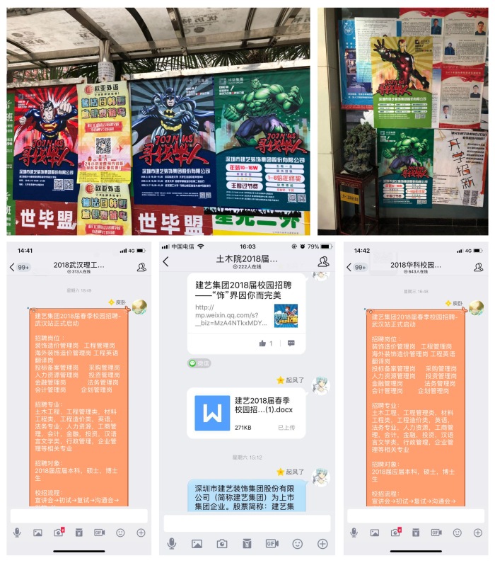 12日,建藝集團(tuán)校招小組在集團(tuán)副總裁趙紂瑜的率領(lǐng)下到達(dá)武漢,在武漢三所高校(華中科技大學(xué)、武漢大學(xué)、武漢理工大學(xué))積極開展線上線下互動(dòng)宣傳活動(dòng)。期間,校招小組成員們通過校園大使、網(wǎng)絡(luò)平臺、宣傳欄、活動(dòng)室等資源,在校園內(nèi)開展了一系列內(nèi)容豐富、信息量大、重點(diǎn)突出的校招宣傳活動(dòng)。此外,小組成員們還積極與校內(nèi)學(xué)子們互動(dòng)交流,廣泛推介建藝品牌,讓學(xué)子們充分了解建藝文化和品牌特色,為后期的宣講會等一系列主題活動(dòng)做好鋪墊。