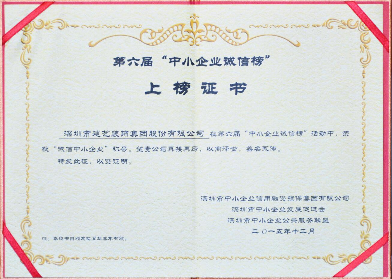 12月10日,由深圳擔(dān)保集團(tuán)、深圳市中小企業(yè)發(fā)展促進(jìn)會(huì)、深圳市中小企業(yè)公共服務(wù)聯(lián)盟聯(lián)合主辦的第六屆“中小企業(yè)誠(chéng)信榜”在深圳揭曉,建藝集團(tuán)等100多家企業(yè)名列本屆“中小企業(yè)誠(chéng)信榜”名單。