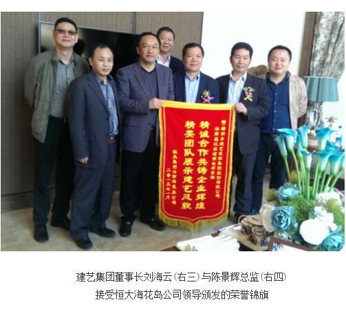 作為合作伙伴,?;◢u公司全體領(lǐng)導(dǎo)一致對(duì)建藝集團(tuán)在前期合作中展現(xiàn)出的專(zhuān)業(yè)、誠(chéng)信、創(chuàng)新、卓越的企業(yè)理念表示極大的認(rèn)同,對(duì)項(xiàng)目部在施工過(guò)程中所表現(xiàn)出的不畏艱難、上下一心、能打仗、打硬仗、全力配合甲方的團(tuán)隊(duì)精神表示高度贊揚(yáng),對(duì)于建藝集團(tuán)工程人員能夠在如此極端艱苦的條件下,忘我的拼搏付出,以高度負(fù)責(zé)的敬業(yè)精神如期完成任務(wù),保證了項(xiàng)目的開(kāi)盤(pán)表示了感謝并向建藝集團(tuán)頒發(fā)錦旗。