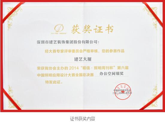 繼7月在中國(guó)建筑裝飾協(xié)會(huì)及中國(guó)建筑裝飾與照明設(shè)計(jì)師聯(lián)盟共同主辦的“2014(第六屆)‘照明周刊杯’中國(guó)照明應(yīng)用設(shè)計(jì)大賽南寧賽區(qū)頒獎(jiǎng)典禮”上斬獲南寧賽區(qū)一等獎(jiǎng)后,建藝集團(tuán)的參賽作品《建藝大廈》在近日再次憑借一流的設(shè)計(jì)思維與應(yīng)用理念,獲得了2014“昭信·照明周刊杯”第六屆中國(guó)照明應(yīng)用設(shè)計(jì)大賽全國(guó)總決賽辦公空間銀獎(jiǎng)。
