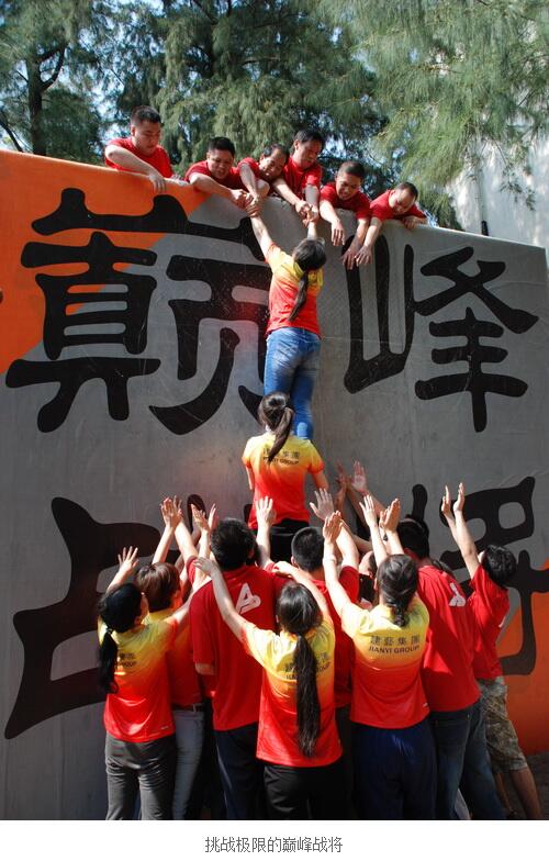 隨著團(tuán)隊(duì)斗志與士氣的提升,挑戰(zhàn)也在逐步升級(jí)。接下來(lái)的“巔峰戰(zhàn)將”項(xiàng)目,則是當(dāng)天拓展活動(dòng)的最大亮點(diǎn),同時(shí)也是全體建藝人面臨的最大挑戰(zhàn)——4.5米高的光滑墻面,需要所有成員在規(guī)定的時(shí)間內(nèi)以最快速度翻越,在此過(guò)程中,全體成員不能借助任何外界的工具,所能用的資源只有每個(gè)人的身體,同時(shí)所有成員更不允許發(fā)出聲音溝通交流,一切只能在無(wú)聲環(huán)境中進(jìn)行。