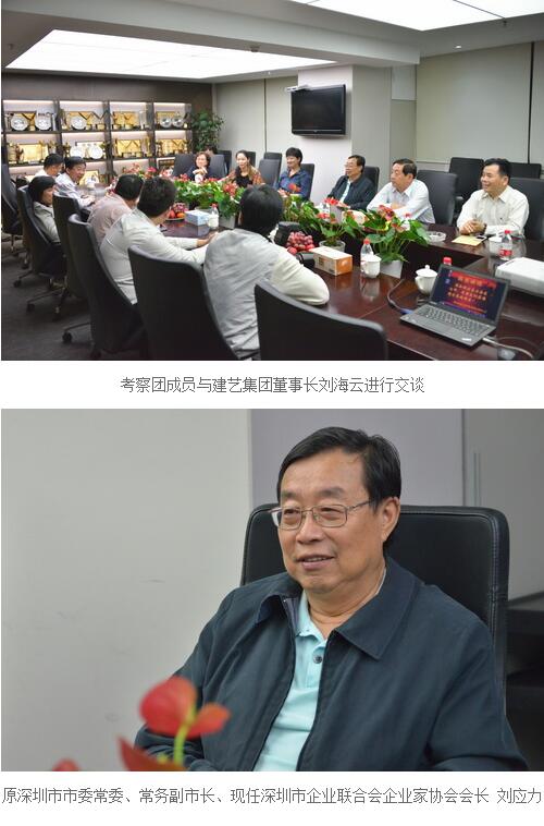 近日,深圳市原市委常委、常務副市長、現(xiàn)任深圳市企業(yè)聯(lián)合會/企業(yè)家協(xié)會(以下簡稱深企聯(lián))會長劉應力及深企聯(lián)常務副會長王志國等領(lǐng)導同4月赴印度、尼泊爾考察團成員一起到訪建藝集團總部。劉海云董事長熱情迎接了到訪領(lǐng)導及成員,并向考察團成員介紹了建藝集團發(fā)展情況。期間,考察團成員們在劉海云董事長的帶領(lǐng)下,參觀了建藝集團機關(guān)和設(shè)計研究院。