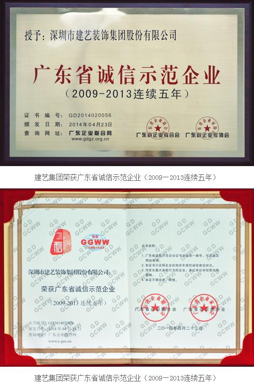 注重品牌與誠(chéng)信,是建藝集團(tuán)一直以來(lái)都遵循的發(fā)展準(zhǔn)則。多年來(lái),以品質(zhì)管理、誠(chéng)信經(jīng)營(yíng)為主旨,建藝集團(tuán)在建筑裝飾領(lǐng)域銳意進(jìn)取,為廣東經(jīng)濟(jì)社會(huì)發(fā)展推注源源動(dòng)力。同時(shí),憑借自身的誠(chéng)信經(jīng)營(yíng)表率,建藝集團(tuán)還以身作則,積極為廣東省企業(yè)誠(chéng)信體系建設(shè)做出應(yīng)盡貢獻(xiàn)。在4月23日舉辦的第20屆廣東省“企業(yè)家活動(dòng)日”大會(huì)上,一批2013年度廣東省優(yōu)秀企業(yè)、優(yōu)秀企業(yè)家、最佳誠(chéng)信企業(yè)、誠(chéng)信示范企業(yè)受到表彰,建藝集團(tuán)憑借出眾的誠(chéng)信管理體系及卓越的行業(yè)發(fā)展表率,再次得到肯定,喜獲“2013年度廣東省優(yōu)秀企業(yè)”及“廣東省誠(chéng)信示范企業(yè)(2009-2013連續(xù)五年)”殊榮,為建藝集團(tuán)2014年“榮譽(yù)簿”譜寫(xiě)了濃墨重彩的一筆。