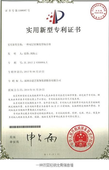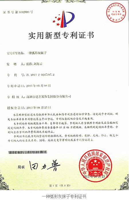 近日,建藝集團(tuán)研發(fā)的二項實用新型專利正式獲得國家知識產(chǎn)權(quán)局的授權(quán)。該二項專利為:一種弧形灰抹子(專利號:ZL201320247297.2)、一種雙層輕鋼龍骨隔音墻(專利號:ZL201320369064.X)。