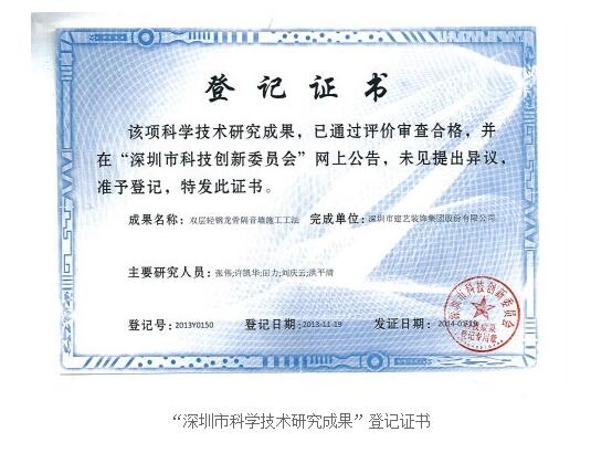 日前,建藝集團(tuán)研發(fā)的“雙層輕鋼龍骨隔音墻施工工法”順利通過深圳市科技創(chuàng)新委員會(huì)的評(píng)價(jià)審查,獲得“深圳市科學(xué)技術(shù)研究成果”登記證書。