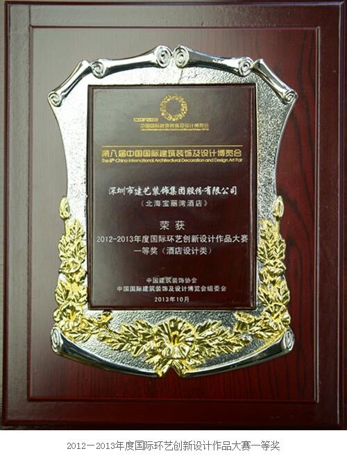 經(jīng)過眾多國內(nèi)外設(shè)計專家的共同探討,作品評審,建藝集團(tuán)憑借著強(qiáng)勁實(shí)力在本次“設(shè)博會”上斬獲兩大獎項,建藝集團(tuán)榮獲2012-2013年度十大最具影響力設(shè)計機(jī)構(gòu)(綜合類);由設(shè)計院郭杰院長主持設(shè)計的北海寶麗灣酒店榮獲2012-2013年度國際環(huán)藝創(chuàng)新設(shè)計作品大賽一等獎(酒店設(shè)計類)。