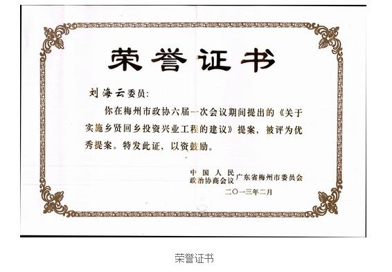 會議期間,劉海云董事長提出了《關(guān)于實(shí)施鄉(xiāng)賢回鄉(xiāng)投資興業(yè)工程的建議》提案。該提案對鄉(xiāng)賢回鄉(xiāng)投資興業(yè)工程提出了多個(gè)操作性強(qiáng)的意見,被中國人民政治協(xié)商會議廣東省梅州市委員會評為優(yōu)秀提案。