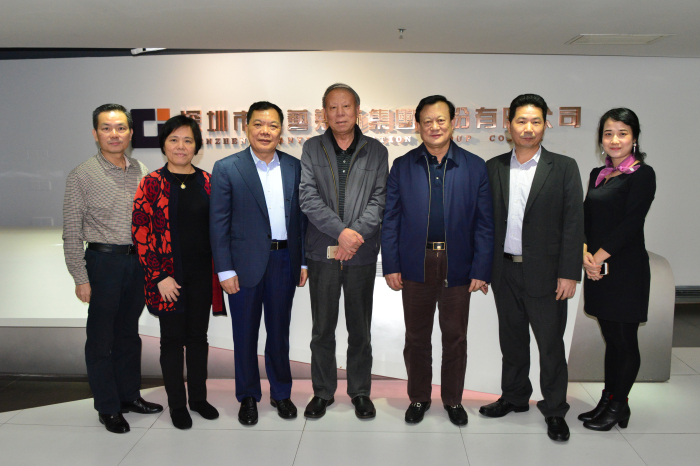 建藝集團(tuán)董事長兼總裁劉海云(左三)等與中國建筑裝飾協(xié)會會長李秉仁(左四)、副會長兼秘書長劉曉一(左五)在集團(tuán)大廳合影